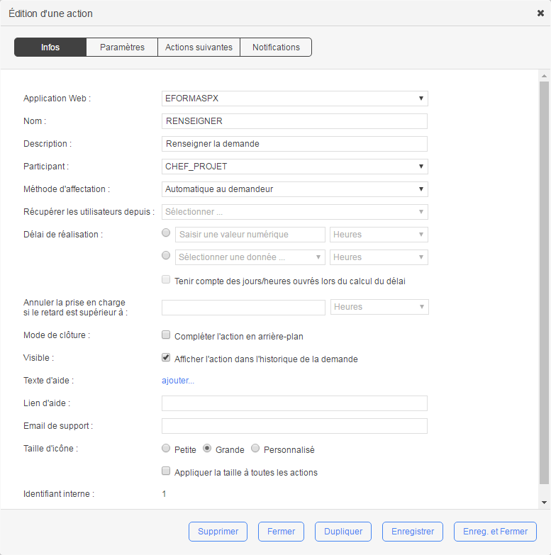 Double-cliquez une action dans la vue Graphique, ou cliquez une action dans la liste des actions pour ouvrir le formulaire d’édition d’une action, qui comprend les onglets suivants :