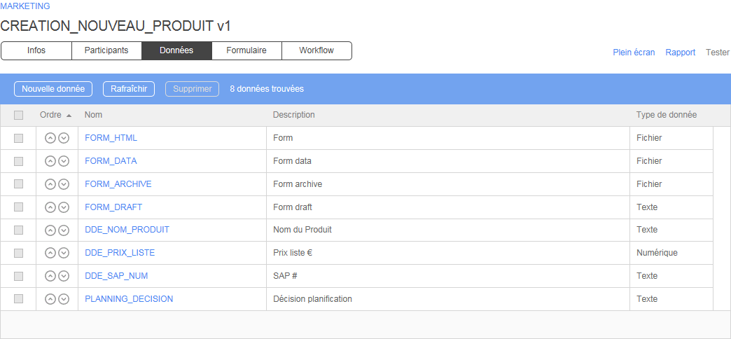 Une donnée ne peut pas être supprimée si elle associée au workflow du processus (en tant que paramètre ou dans les conditions des transitions). Une donnée ne peut pas être supprimée si elle est définie en tant que paramètre d’un sous-processus et utilisé par un processus parent.