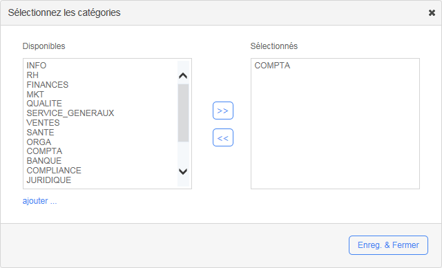 Ajoute les catégories sélectionnées dans la liste Disponibles dans la liste Sélectionnées
