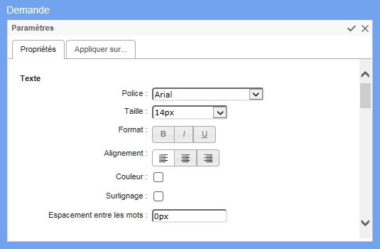 Texte vous permet de modifier l'apparence du texte, l'alignement et l'espacement entre les mots. Disposition vous permet de modifier la largeur et le rembourrage de l'élément. Bordures vous permet d'ajouter des bordures et en modifier l'apparence. Disposition du conteneur vous permet de régler les marges du haut, de gauche et de droite du conteneur.