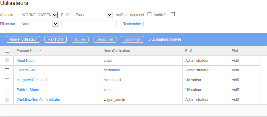 * Champs utilisés dans le cadre de synchronisation avec Active Directory. Ce champ n'est pas utilisé par l'application. Toutefois, il est possible de l'utiliser dans les macros du workflow.