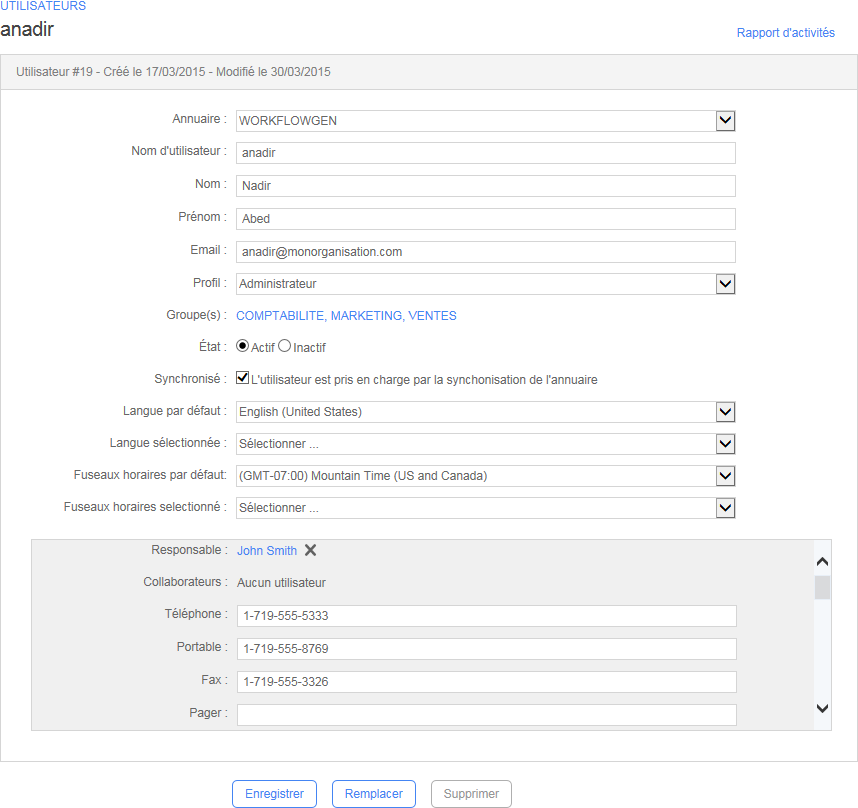 Vous pouvez remplacer un utilisateur par un autre. L’utilisateur de remplacement doit appartenir au même annuaire et au même groupe. Toutes les responsabilités seront transfère à l’utilisateur de remplacement.