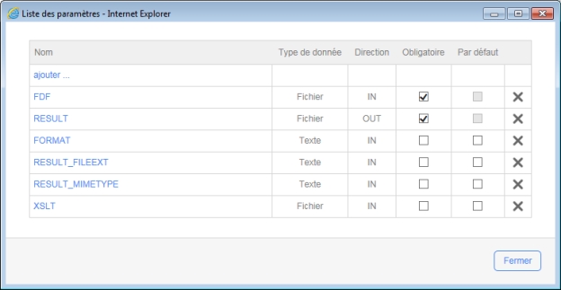 * Le lien de suppression est identifié par un x visible uniquement si l'application n'est pas utilisée par une action de processus.