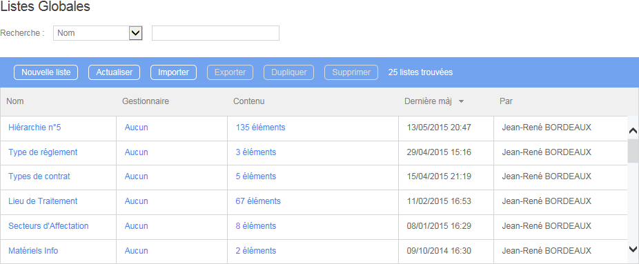 Une liste globale statique est alimentée manuellement par les utilisateurs habilités dans l’interface prévue à cet effet du module d’administration.