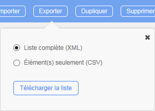 Exporter des données dans un fichier CSV ou XML; ceci est utile pour exporter des données de multiples environnements (développement, production, etc...)