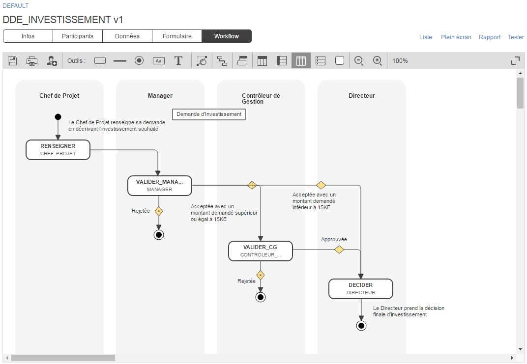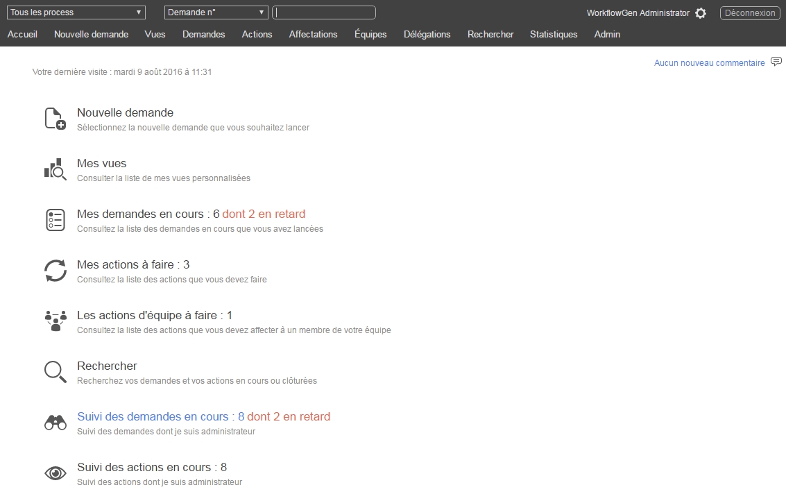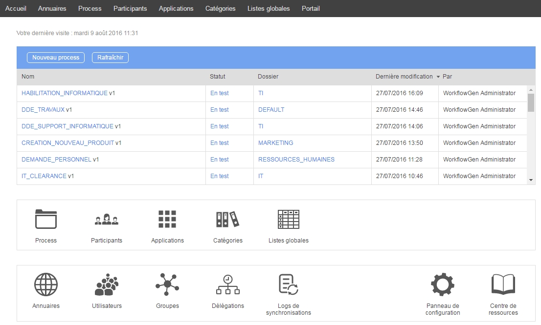 Les gestionnaires de dossier ont accès à la définition et aux statistiques des processus de leur(s) dossier(s). Ils n’ont pas d’accès aux annuaires, groupes, la gestion d’utilisateurs, délégations, participants globales et la gestion des applications.