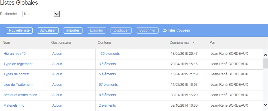 Cliquez sur Listes globales sur le bandeau pour ouvrir la liste des listes globales.