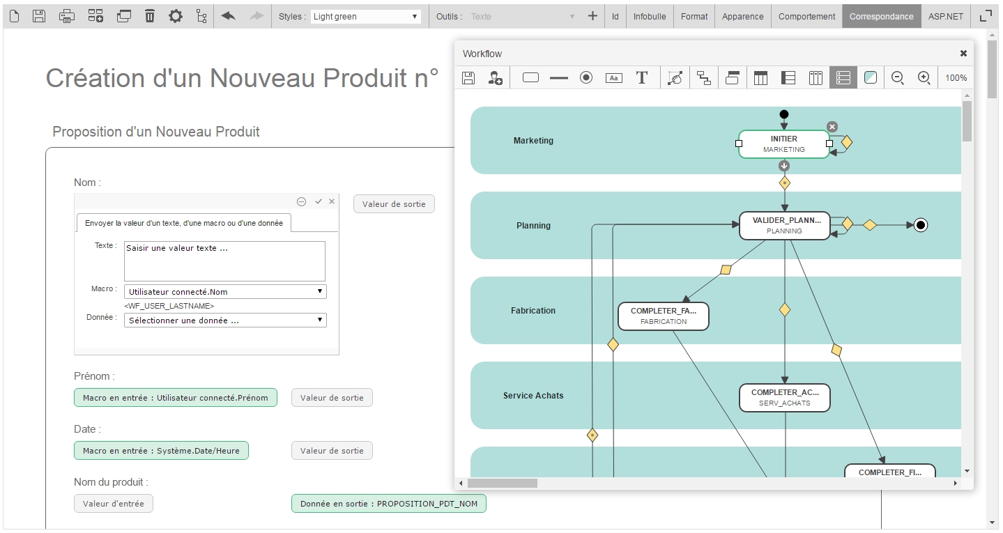 L’écran Correspondance permet de définir visuellement et à l’aide de simples clics ou de boîtes de dialogue les valeurs par défaut (données en entrée) et/ou les données qui seront stockées par le workflow (données en sortie) des champs du formulaire pour chacune des actions du workflow.