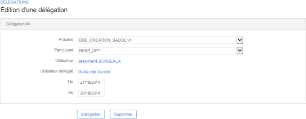 Utilisateur associé avec le participant sélectionné (délégataire) dont on veut déléguer une fonction de processus.