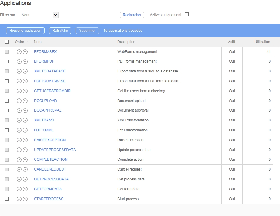 * Le lien de suppression est identifié par un x visible uniquement si l'application n'est pas utilisée par une action de processus.
