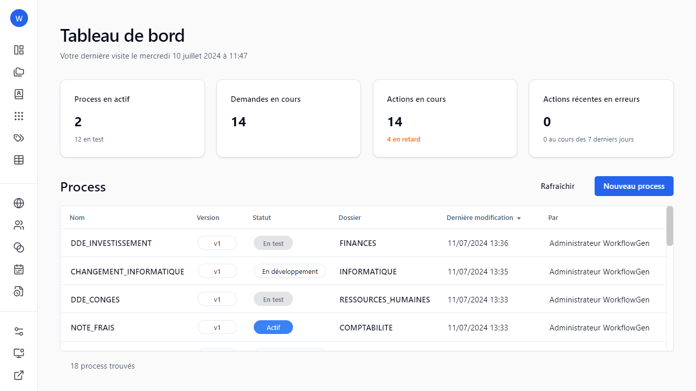 Les gestionnaires de dossier ont accès à la définition et aux statistiques des processus de leur(s) dossier(s). Ils n’ont pas d’accès aux annuaires, groupes, la gestion d’utilisateurs, délégations, participants globales et la gestion des applications.
