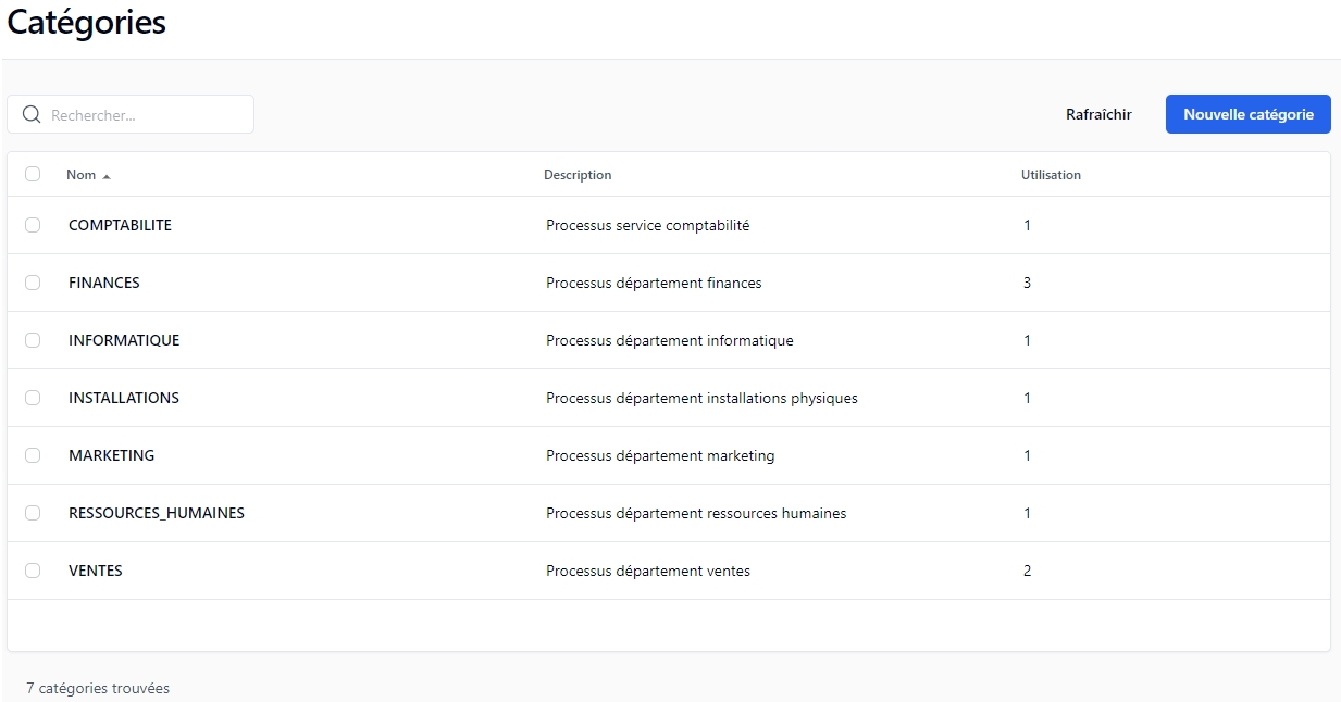 Une catégorie ne peut pas être supprimée si elle est utilisée par un processus.