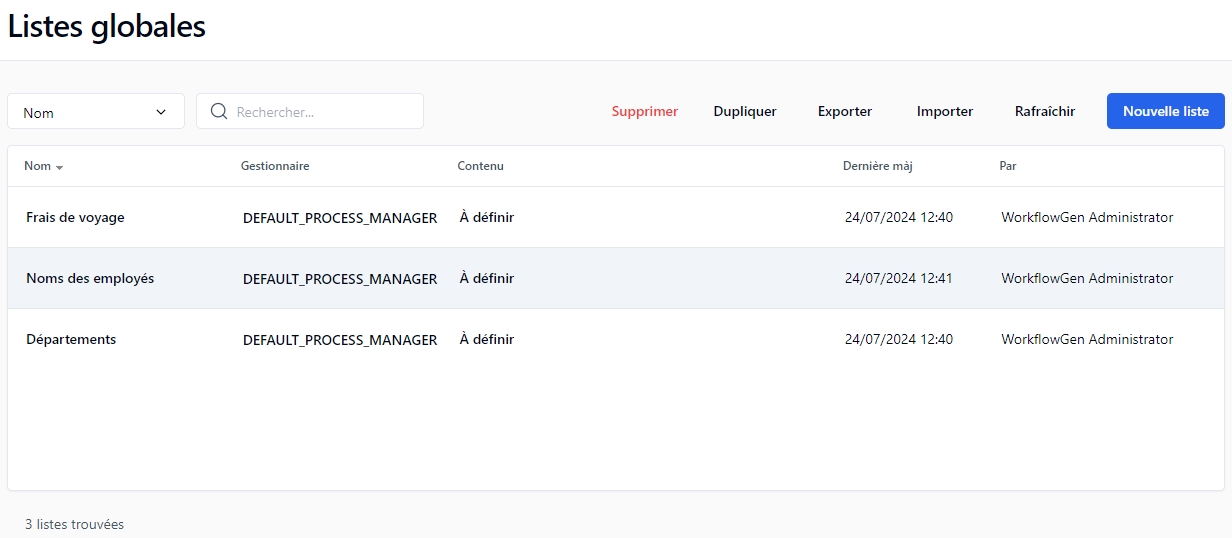 Le module des listes globales permet à des utilisateurs autorisés de créer et de gérer facilement des listes de données depuis le module d'administration de WorkflowGen. C'est une solution pour gérer et centraliser les données qui alimenteront des listes déroulantes de vos formulaires utilisés dans le cadre de vos workflows.