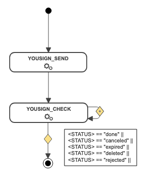 Dans l'exemple suivant, l'action YOUSIGNSEND est directement suivie par l'action YOUSIGNCHECK. Cette action reviendra sur elle-même jusqu'à ce que le statut passe à done, canceled, expired, deleted ou rejected.