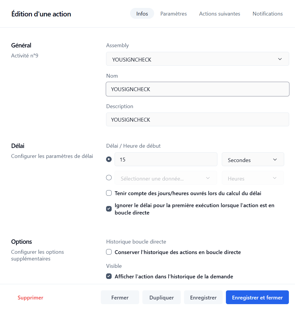 Avec la fonction d'action de boucle système, l'action YOUSIGNCHECK sera exécutée toutes les x secondes jusqu'à ce que la condition OUT soit remplie.