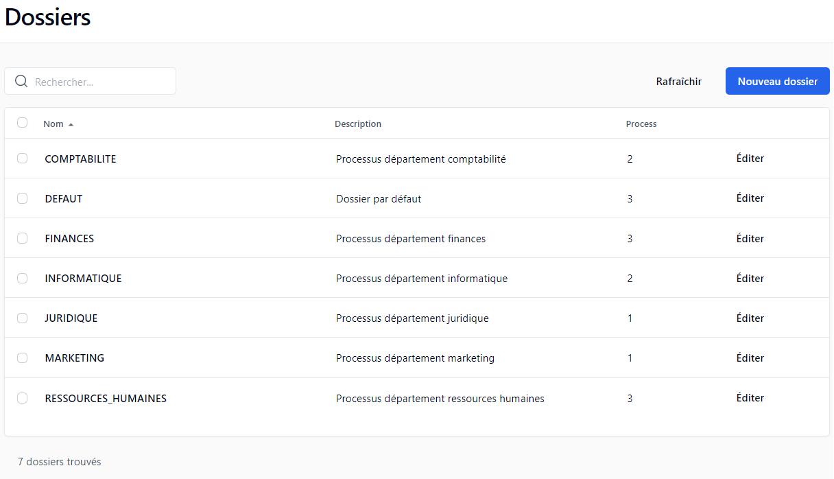 Les processus sont organisés en dossiers administrés par des gestionnaires. Un niveau unique de dossier est possible dans WorkflowGen.