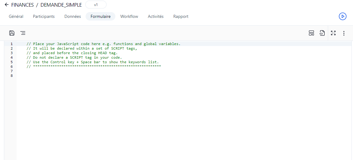 dans la barre d'outils pour ouvrir l'éditeur de code JavaScript, qui peut être utilisé pour définir des procédures côté serveur, des événements et des variables globales pour gérer des tâches personnalisées spécifiques. Cette fonctionnalité est principalement destinée au développement côté client JavaScript.