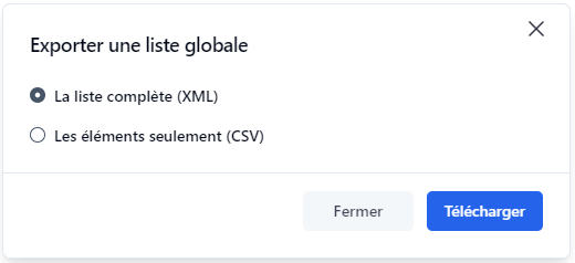 Vous pouvez exporter les données d’une liste globale dans un fichier. Les formats supportés sont les listes globales WorkflowGen XML ou CSV.