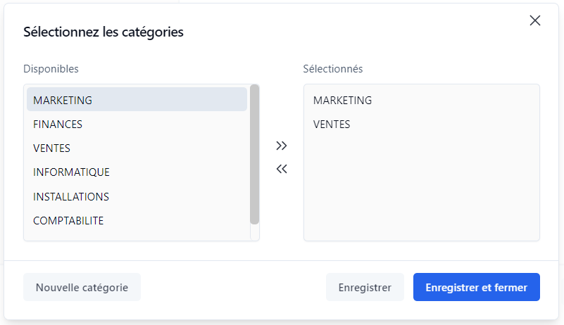 Ajoute les catégories sélectionnées dans la liste Disponibles dans la liste Sélectionnées