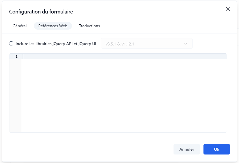 Cochez cette option pour inclure les bibliothèques d'interface utilisateur jQuery et jQuery en mode d'exécution (exécution de formulaire); par défaut, ces bibliothèques sont disponibles en mode design