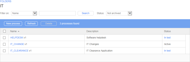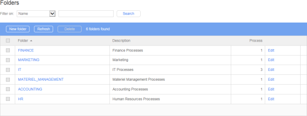 Processes are organized in folders administered by managers. Only one folder level is possible in WorkflowGen.