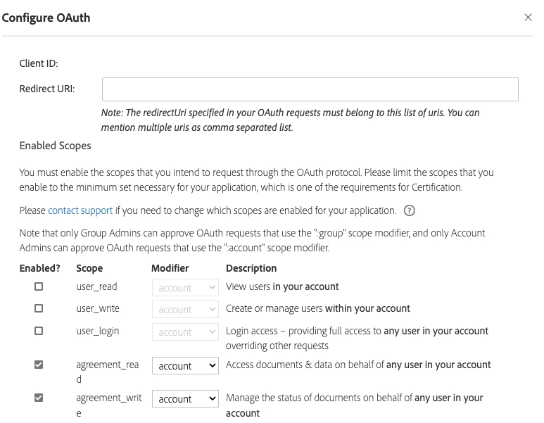 <HOST_SERVER>: Your Adobe Sign account's host server. Usually, the URL is composed like this:https://api.naX.adobesign.com, whereXis the server ID.<REDIRECT_URI>: The URL that you defined in your Adobe Sign application.<CLIENT_ID>: Your Adobe Sign application's client ID.