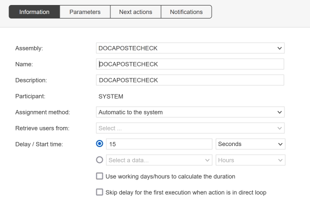 With the system loop action function, the DOCAPOSTECHECK action will be executed every x seconds until the OUT condition is met.