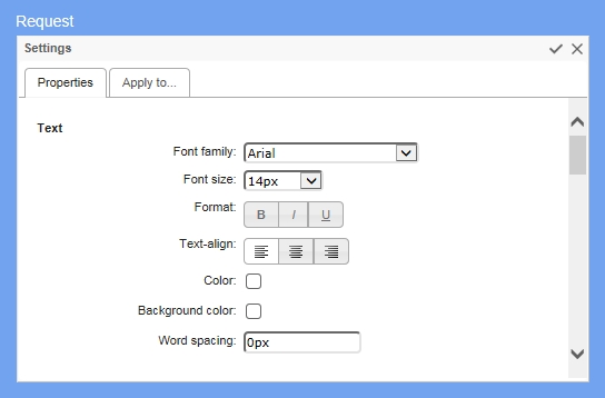 To use Express mode, hover over the item you want to customize and a toolbar will appear that lets you change the appearance of text and the size of the top margin. (If the item contains several fields, toolbars will appear in the corresponding positions.) You can also change the width of labels and fields.