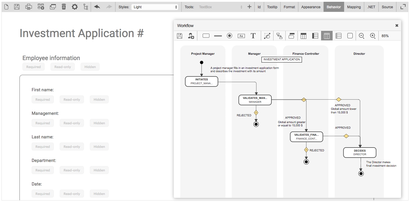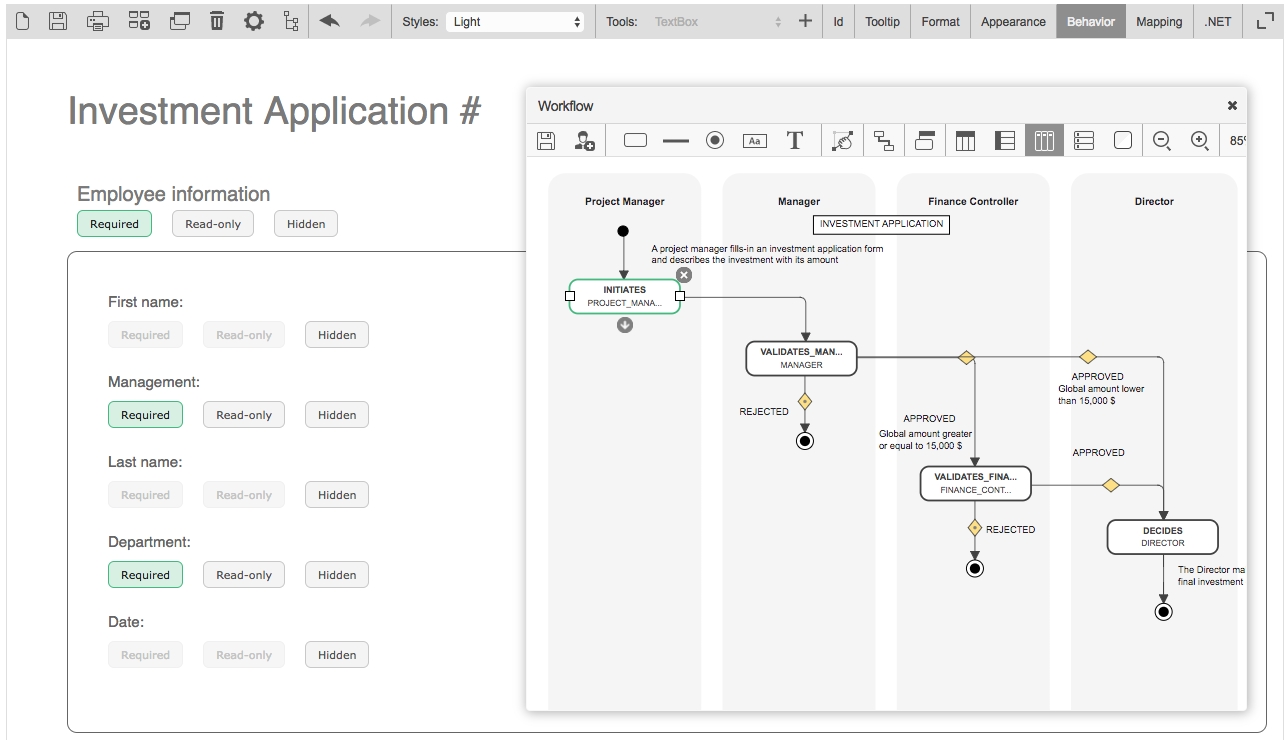 The Behavior section is used to visually define the behavior of form sections nd fields for each action of the workflow.