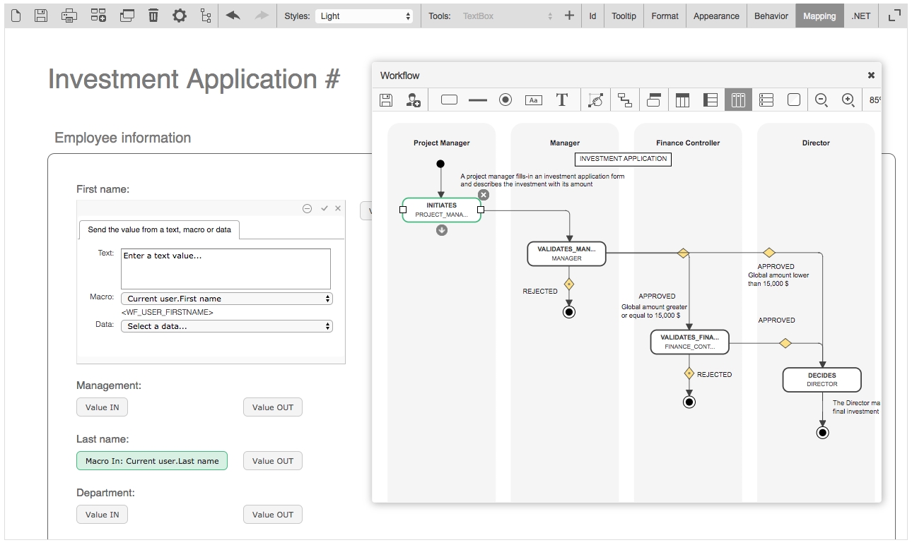 The Mapping screen enables you to visually define the default values (data in) and/or data to be stored by the workflow (data out) of the form fields for each action of the workflow.