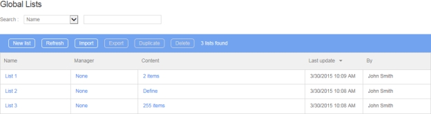 Global Lists screen