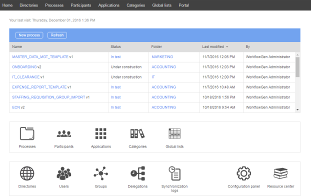 Administrators have no access restrictions except for the Configuration Panel, which requires specific access rights (see the WorkflowGen Technical Guide for more information).