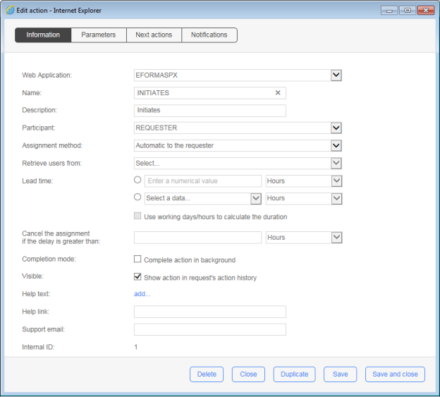Double-click an action in Graphical view or click an entry in List view to open the Edit action form, which includes the following tabs: