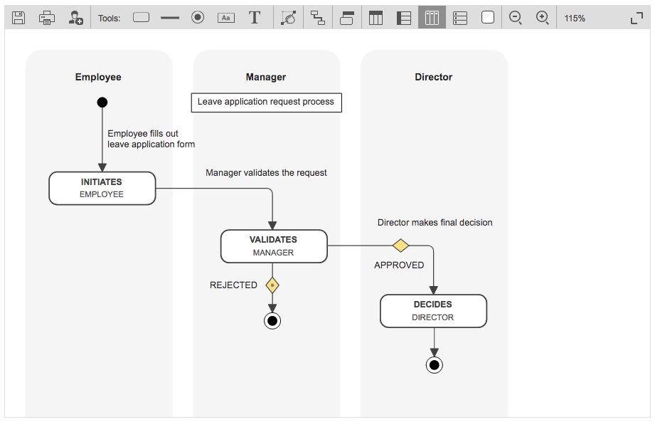Add a vertical swim lane overlay on the graphical view with actions displayed in the participant columns