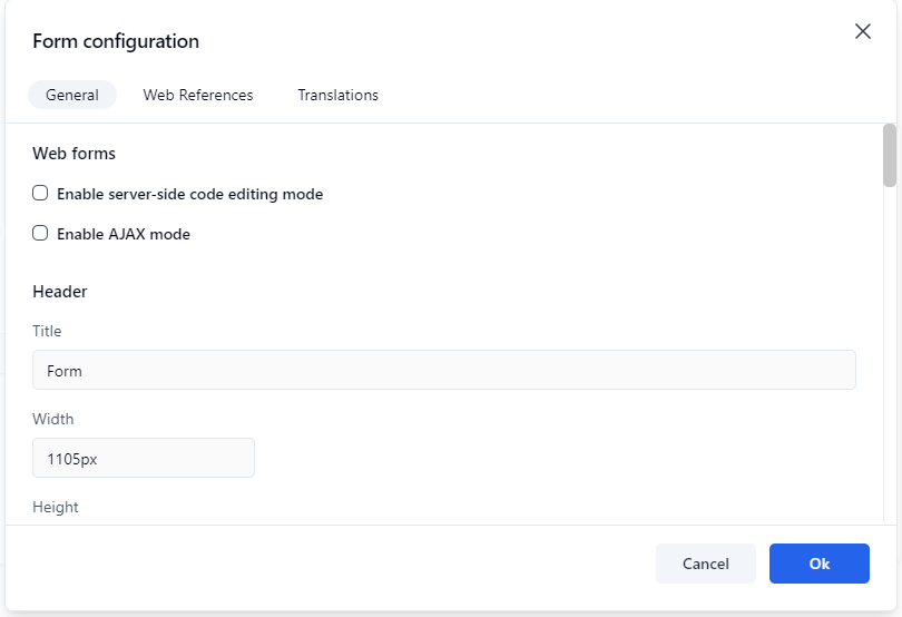 Check Enable server-side editing mode on the General tab in the Form configuration panel to activate this mode, which allows form designers to modify the content of the form's C# runat server tag (e.g. <script runat="server") and JavaScript script tag (e.g. <script jseditor="true">) directly in the generated default.aspx file on the server (usually located in the \wfapps\webforms[PROCESSNAME]\V[VERSION] folder) using Visual Studio Professional or Visual Studio Code.