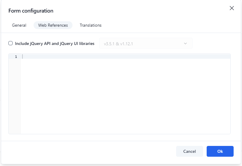 Custom web references to be included in the HTML head that will be available in both design and run-time modes. Only <script>, <meta>, <link>, and <style> tags are supported. When you enter a tag, the free text editor automatically inserts its closing tag.