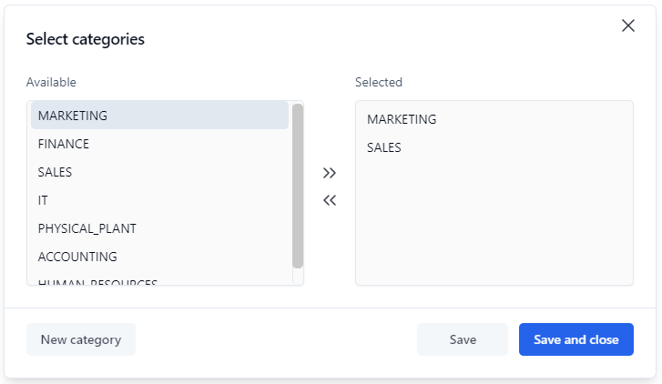 Add selected categories from the Available list to the Selected list