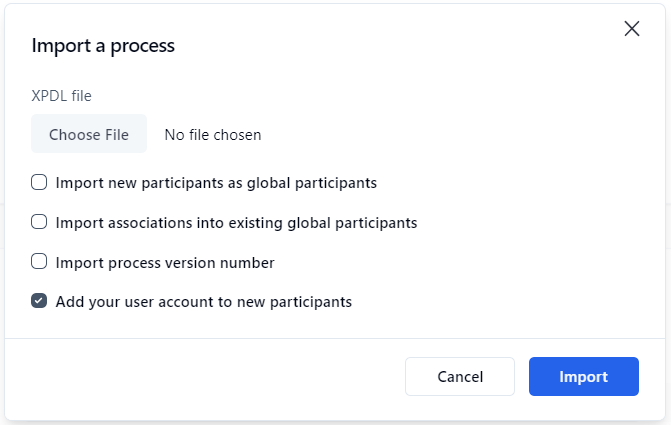 ✏️ Note: The Import associations into existing global participants option is always available to administrators, but is only available to process managers when Restrict process managers from editing global participants is set to false. For information on this, see Security in the Configuration Panel section.