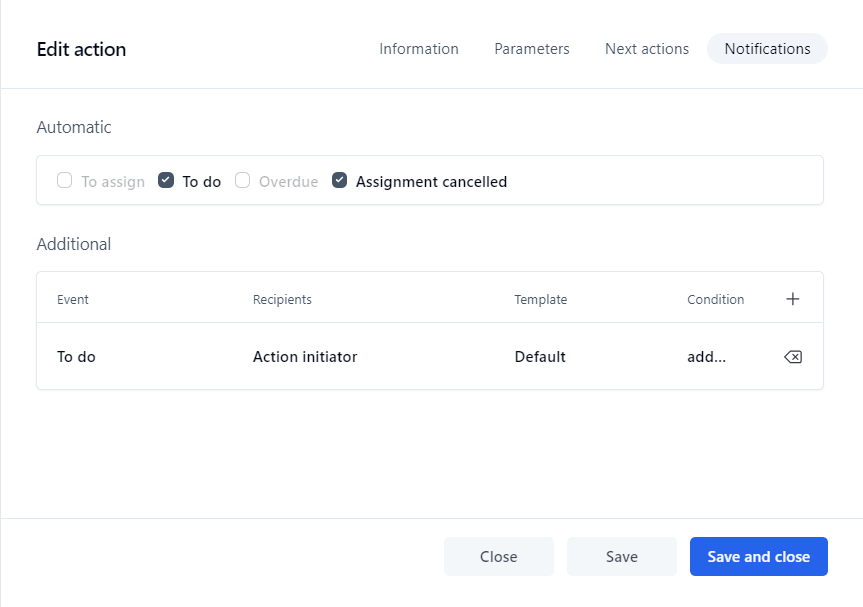 To add an additional notification, click the plus sign (+) in the rightmost column header, choose an event and a template if desired (otherwise these will use the defaults of To do and Default, respectively), then choose the recipient(s). Click again to save the notification. You can then add a condition if desired.