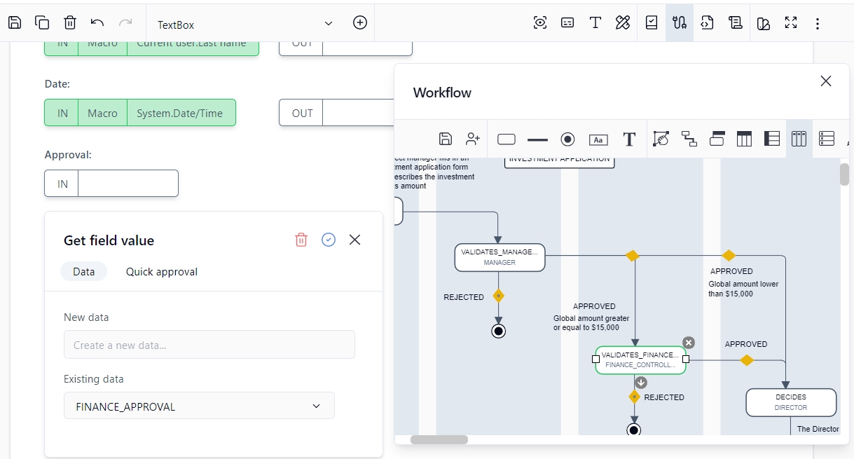 Fields whose values have been sent are automatically declared in the Data tab of the process definition and will be usable as workflow transitions, as tracking features and analytics (reporting), etc.