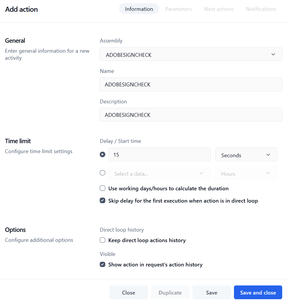 In the following example, the ADOBESIGNSEND action is directly followed by the ADOBESIGNCHECK action. This action will loop back onto itself until the status changes to SIGNED, APPROVED, CANCELLED, EXPIRED, or ARCHIVED.