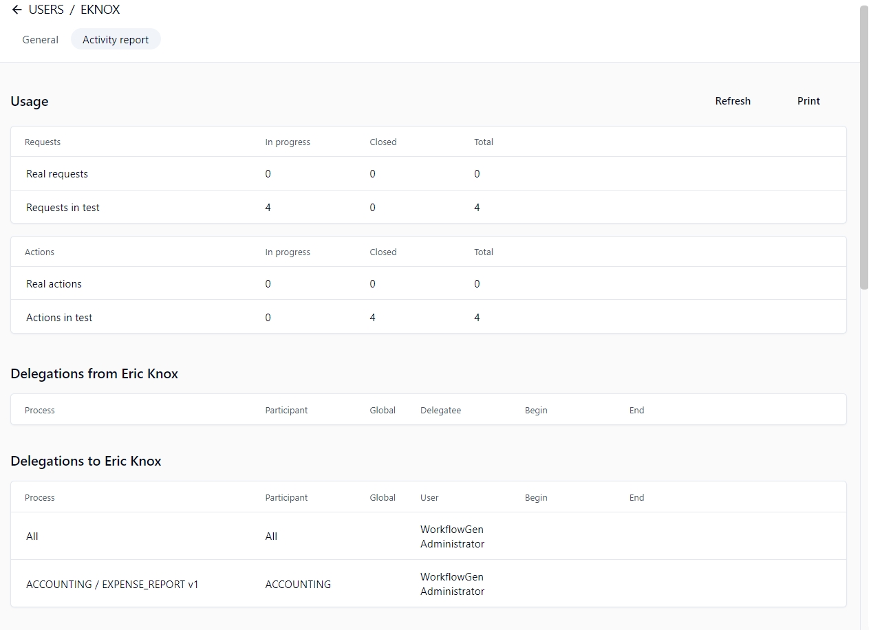Click Activity report in the user form to display their usage (requests and actions), delegations to and from them, the participants to which they belong, and their folder and global list managers.