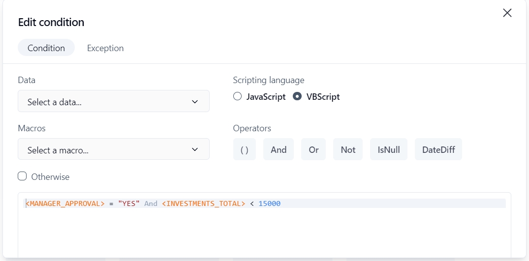 <DATA1> == "Lorem ipsum" || (<DATA2> > 10000 && <DATA3> == "Director")VBScript:
