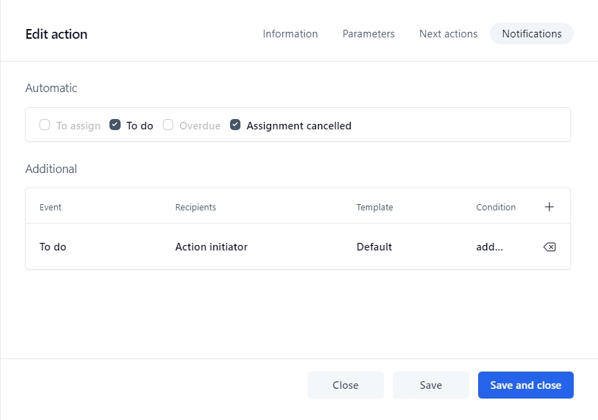 To add an additional notification, click the plus sign (+) in the rightmost column header, choose an event and a template if desired (otherwise these will use the defaults of To do and Default, respectively), then choose the recipient(s). Click again to save the notification. You can then add a condition if desired.