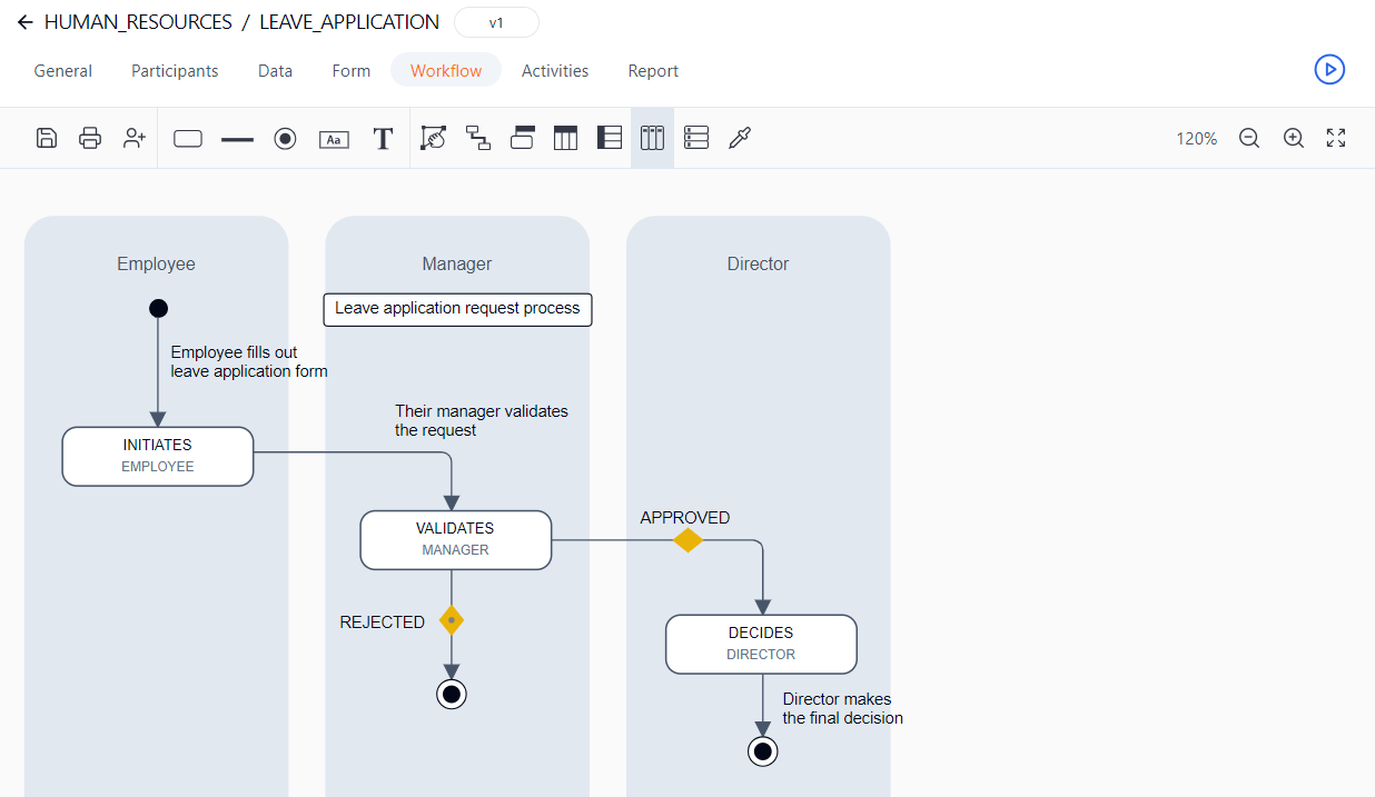 WorkflowGen features an HTML5 graphical process workflow designer, built on the latest HTML5 and SVG standards. It provides a simple user interface and intuitive behavior for a more fluid design experience and enhanced compatibility with different design environments (such as mobile devices).