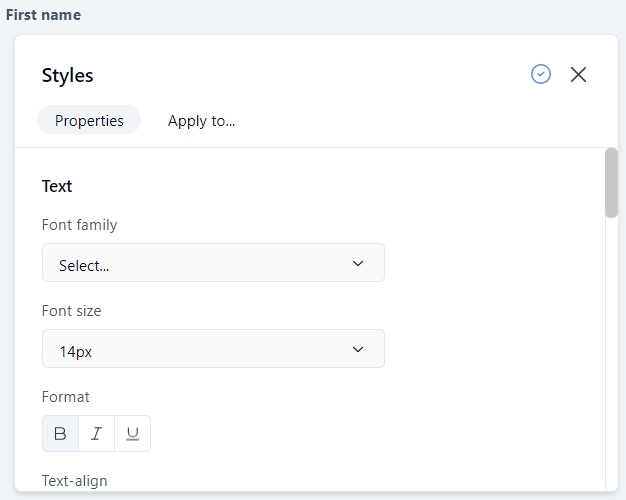 The Text section lets you set the text appearance, alignment, and word spacing. The Layout section sets the width and padding of the item. In the Borders section, you can add borders and customizes their appearance. The Field section sets the top, left, and right margins of the field.