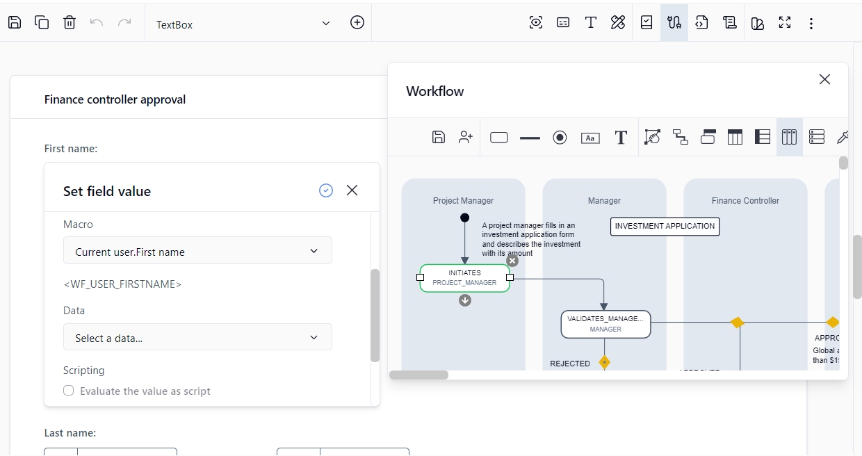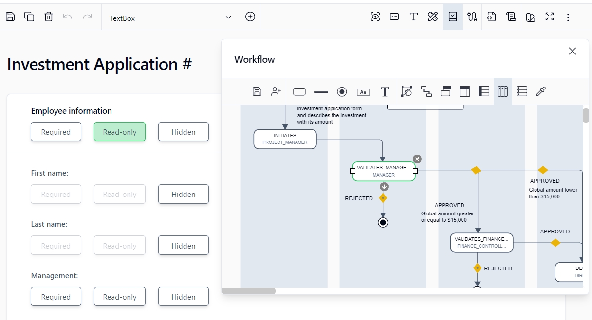 To define the behavior of the form for the other actions of the workflow, click another action via the interactive workflow view and repeat the above operation according to the desired behavior.