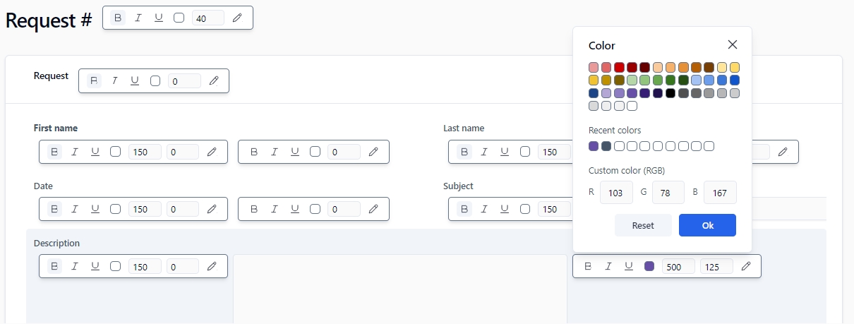 To use Express mode, hover the mouse over the item you want to customize and a toolbar will appear that lets you change the appearance of text and the size of the top margin. (If the item contains several fields, toolbars will appear in the corresponding positions.) You can also change the width of labels and fields.