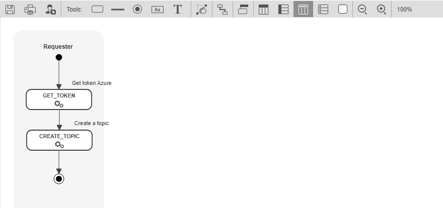 This example shows how to obtain an access token and use it to create an Event Grid topic. This can be done by creating a process with two actions having RESTAPICLIENT as application. The workflow below illustrates this example: