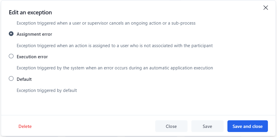 • If an exception path is linked to the end of the process and the exception occurs at runtime, all the ongoing actions are cancelled and the request is closed with the status Closed – Cancelled.